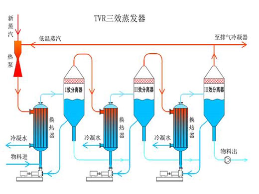 三效蒸發(fā)器是MVR蒸發(fā)器的一種,主要由三個蒸發(fā)器組合而成,三效蒸發(fā)器在運(yùn)行時,需要后效的壓強(qiáng)和溶液的沸點(diǎn)均低于前效蒸發(fā)器,引入前效的二次蒸汽作為后效的加熱介質(zhì),即后效的加熱室成為前效二次蒸汽的冷凝器,一般一效需要消耗生蒸汽。